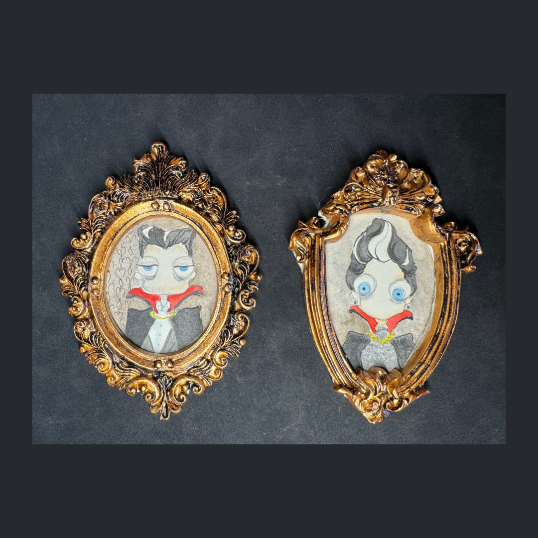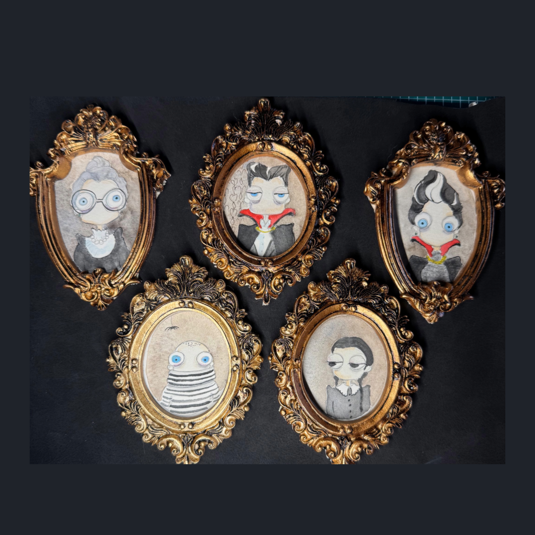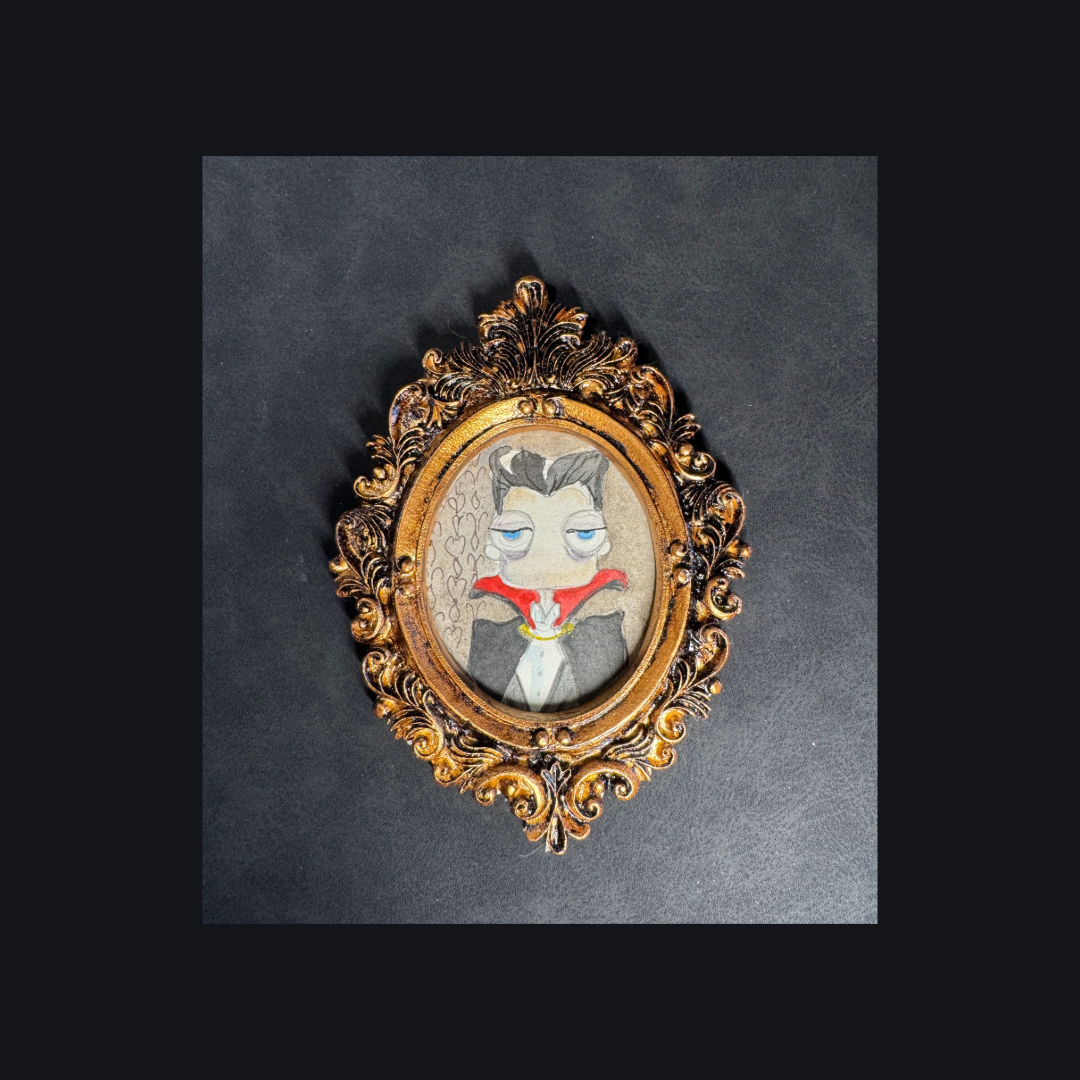 Un piccolo ritratto unico, interamente realizzato a mano, racchiuso in una cornice dorata barocca che sembra uscita da una casa stregata. Parte della collezione esclusiva Mostri in cornice, ogni pezzo racconta un personaggio ironico e misterioso, perfetto per dare un tocco gotico e originale a qualsiasi ambiente.