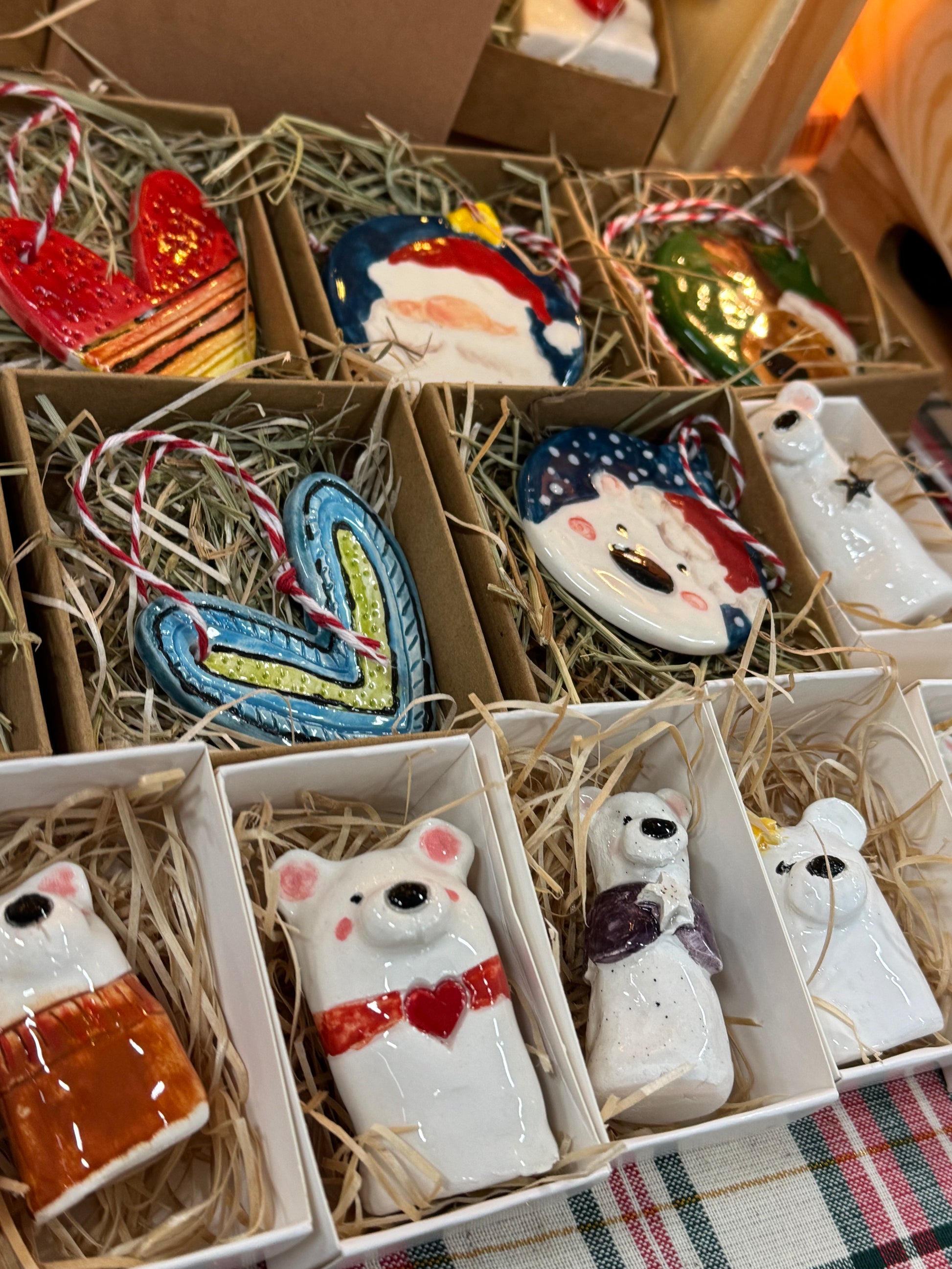 Realizzati interamente a mano, uno per uno, questi orsetti sono modellati, dipinti e smaltati nel mio laboratorio. Nessuno è identico all’altro: ognuno ha la sua espressione dolce, la sua postura buffa, il suo vestitino illustrato e una piccola storia da raccontare.