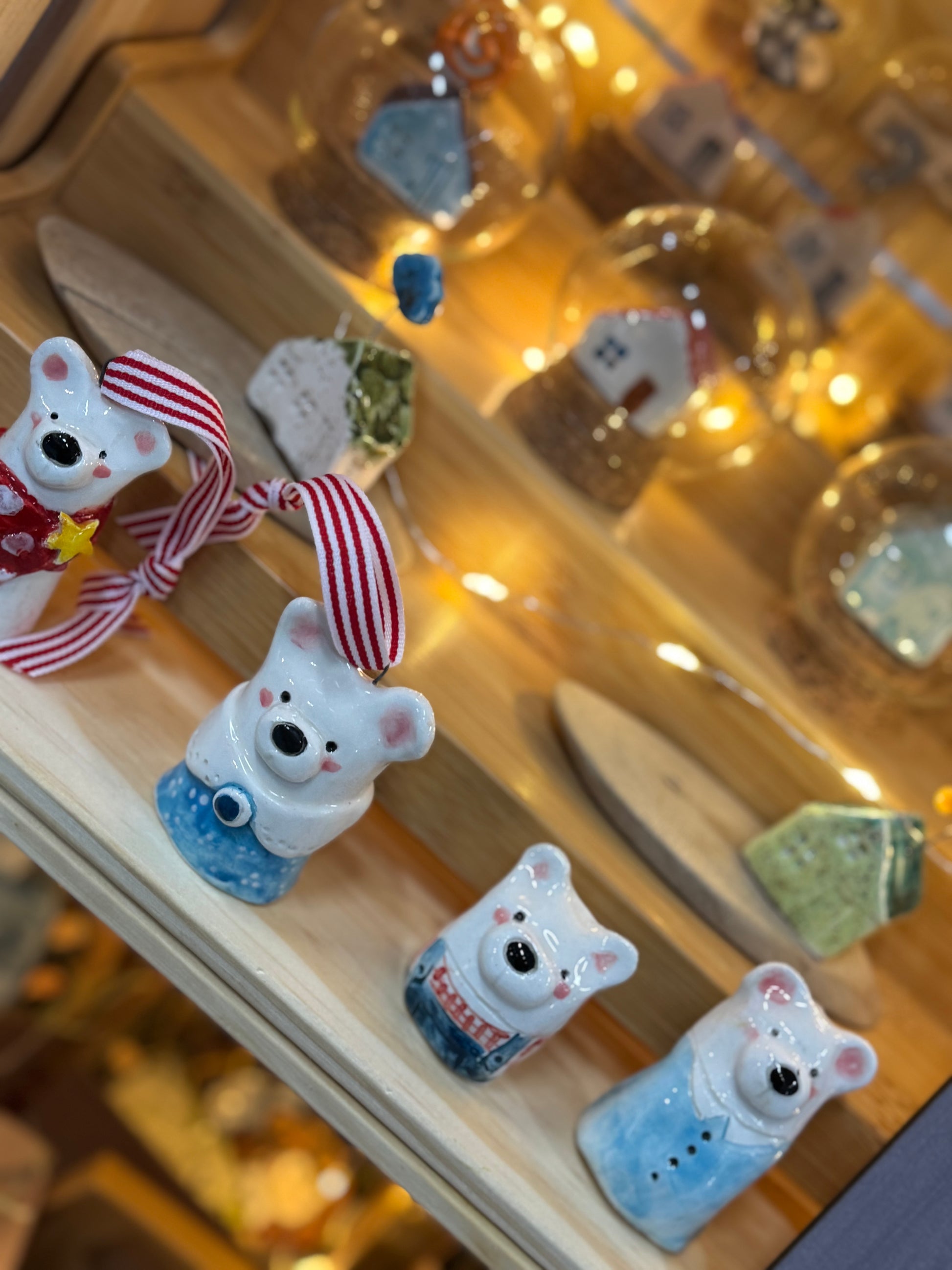 Gli orsetti sono pensati per essere piccoli compagni di atmosfera: accanto a una tazza fumante, su una mensola illuminata, dentro una campana di vetro, appesi all’albero o anche regalati come porta-fortuna.